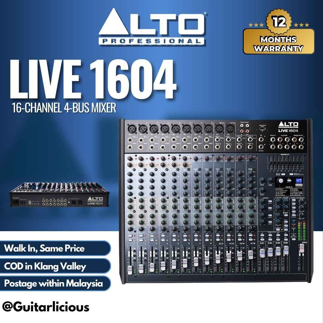 The Alto Professional Live 1604 is a pro 16-channel, 4-bus mixer equipped with the tools you need to create the perfect mix. With flexible routing options and a multitude of onboard DSP tools, Live 1604 fits the demands of nearly any live performance environment. It features 10 balanced XLR inputs with switchable phantom power, 3-band EQs with sweepable mids for additional tonal shaping, four aux sends per-channel for external effects and monitoring, and a 9-band graphic EQ for main or monitor outputs. A headphone jack with an independent level control enables additional monitoring and mixing. 60mm faders with LED meters provide precise control and visual feedback for accurate, hands-on mixing. With its diverse connectivity options, Live 1604 can handle any sized event from small coffee house gigs to mid-sized ensembles to full-stage rock bands.