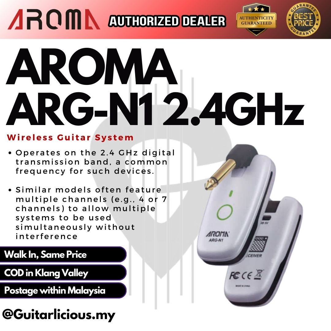 The Aroma 2.4GHz Wireless Guitar System ARG-N1 is a compact, rechargeable, and portable system designed to provide a stable, wireless connection for electric musical instruments. It features multiple channels, plug-and-play functionality, and a swivel jack for versatile use with various instruments