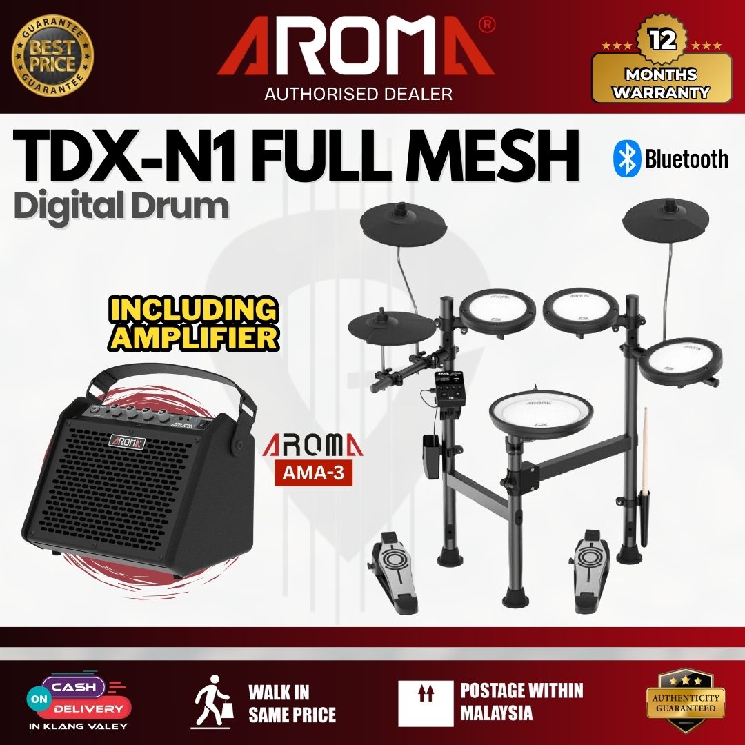The Aroma TDX-N1 Full Mesh Digital Drum is a compact, portable electronic drum kit suitable for beginners and casual players, which is often sold with the 30-watt AMA-30 drum amplifier. The TDX-N1 features full mesh drum pads for a more natural rebound and quiet playing experience. The bundled AMA-30 amplifier provides enough power for small practices or home use.