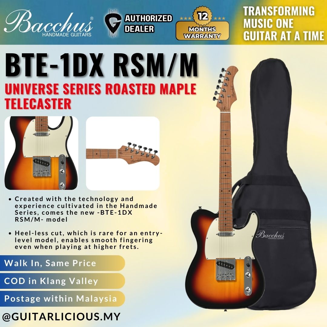 Bacchus BTE-1DX-RSM/M Universe Series Roasted Maple Telecaster Electric Guitar - 3-Tone Sunburst.From the entry line Universe Serie, created with the technology and experience cultivated in the Handmade Series, comes the new -BTE-1DX RSM/M- model, which combines modern specs and traditional looks. The stainless steel frets and heel-less cut of the neck joint common to the Deluxe, or “DX” models provide playability that is similar to that of higher-end models.