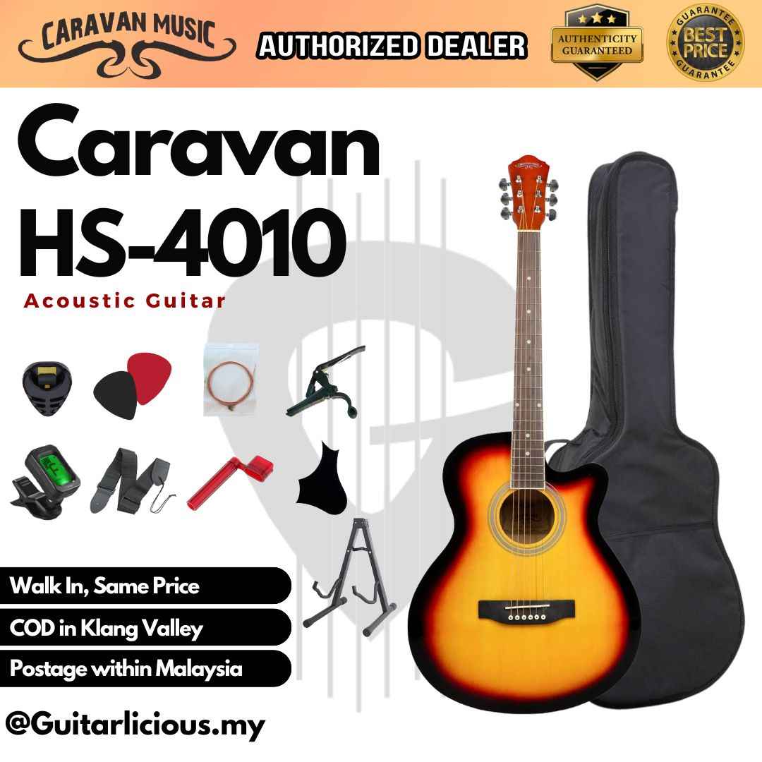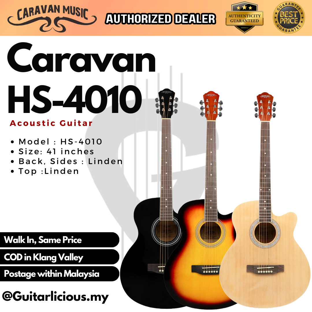 The Caravan HS-4010 is a 40-inch standard acoustic guitar, designed as a beginner-friendly instrument with a classic, full-body design. It is built with a Linden (basswood) top, back, and sides, giving it a balanced and warm tone. The neck is made of mahogany for stability and durability, and the fretboard is crafted. It features ABS binding around the body for added protection and style. The finish is highly glossy, giving the guitar a sleek, polished look. The tuning machines are die-cast, solid and reliable for tuning stability.