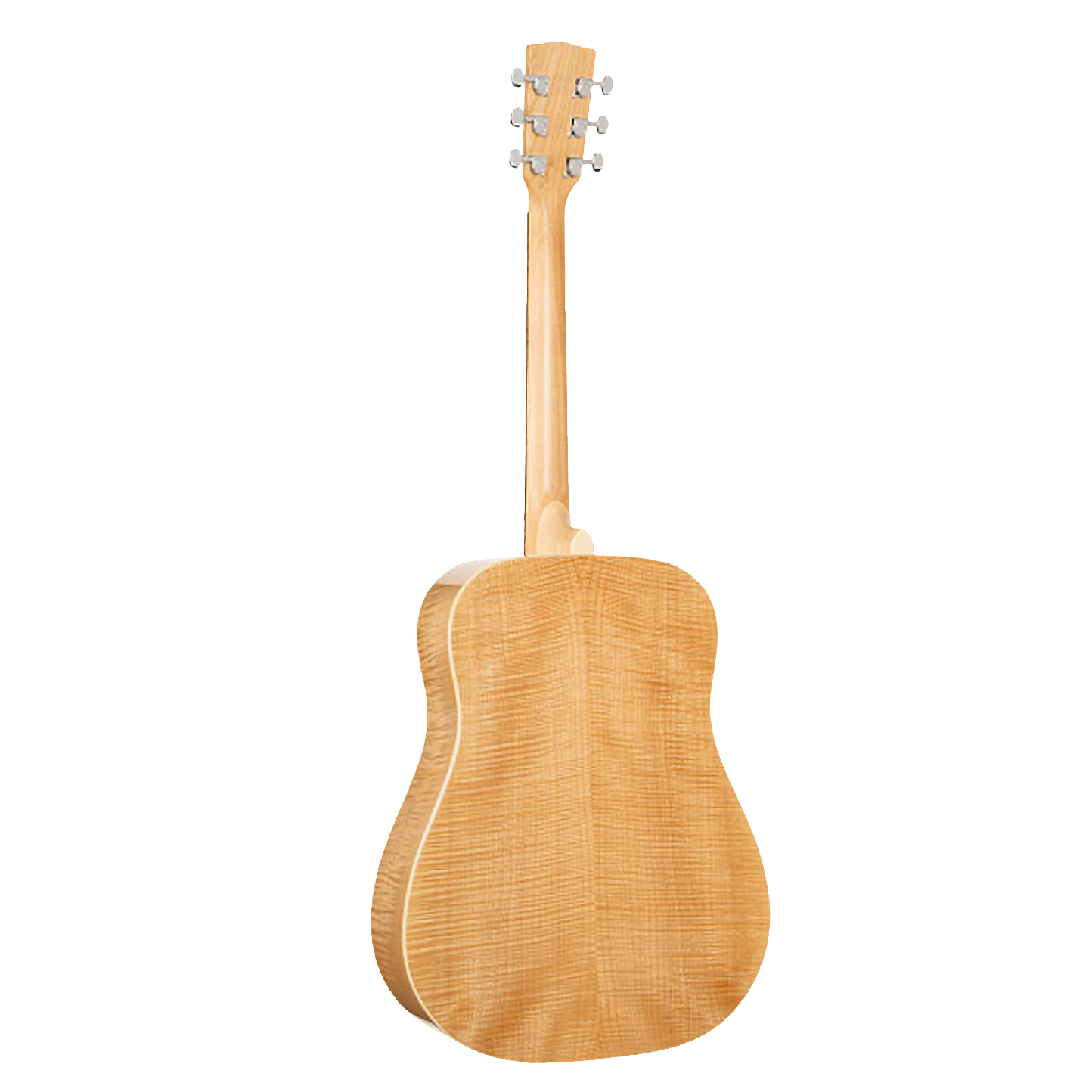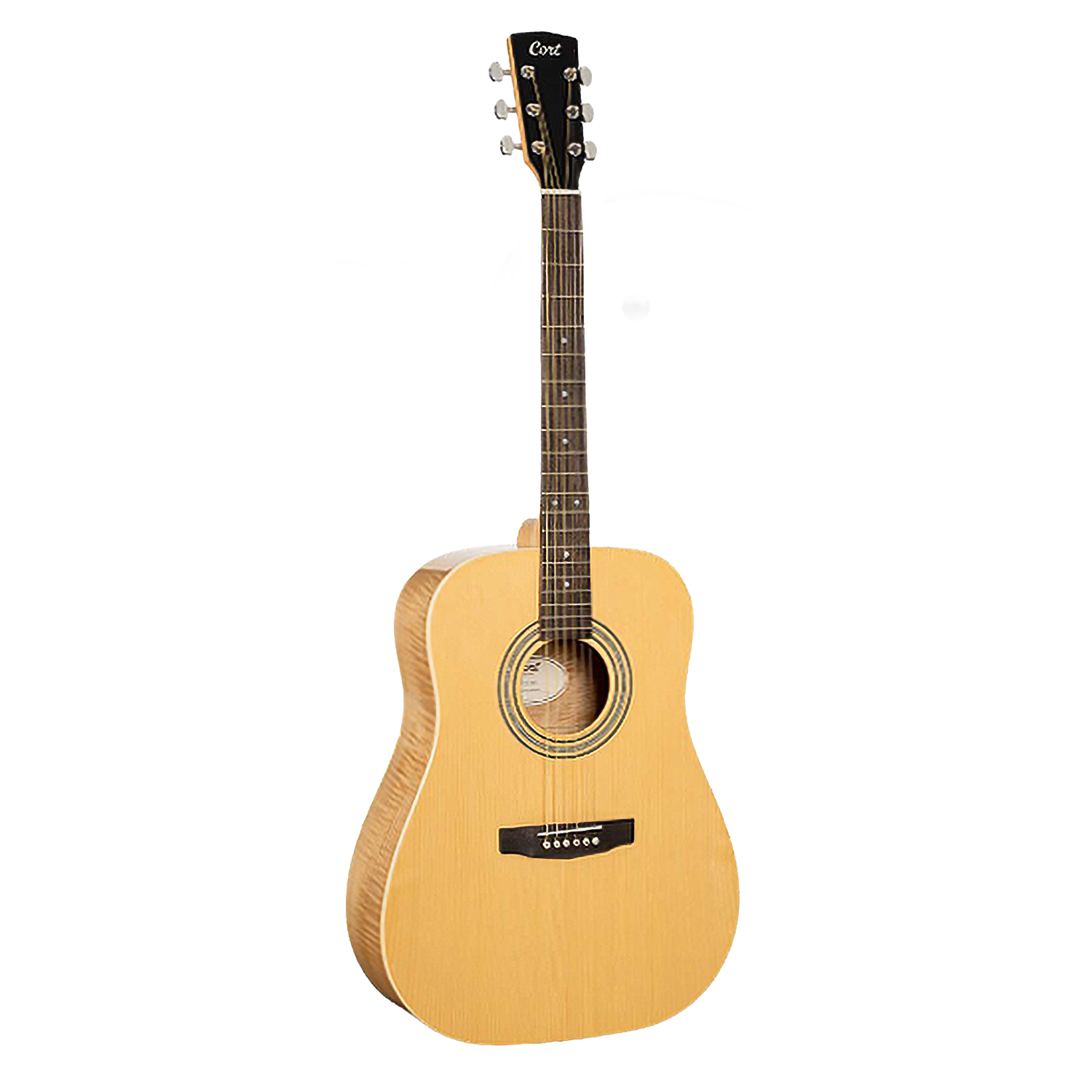 The Cort AD-FM Acoustic Guitar W/Bag is a full-size dreadnought acoustic guitar with a natural gloss finish and flame maple back and sides. The guitar is known for its playability and visual appeal, making it a good option for beginners to intermediate players. It comes with a gig bag for protection and portability