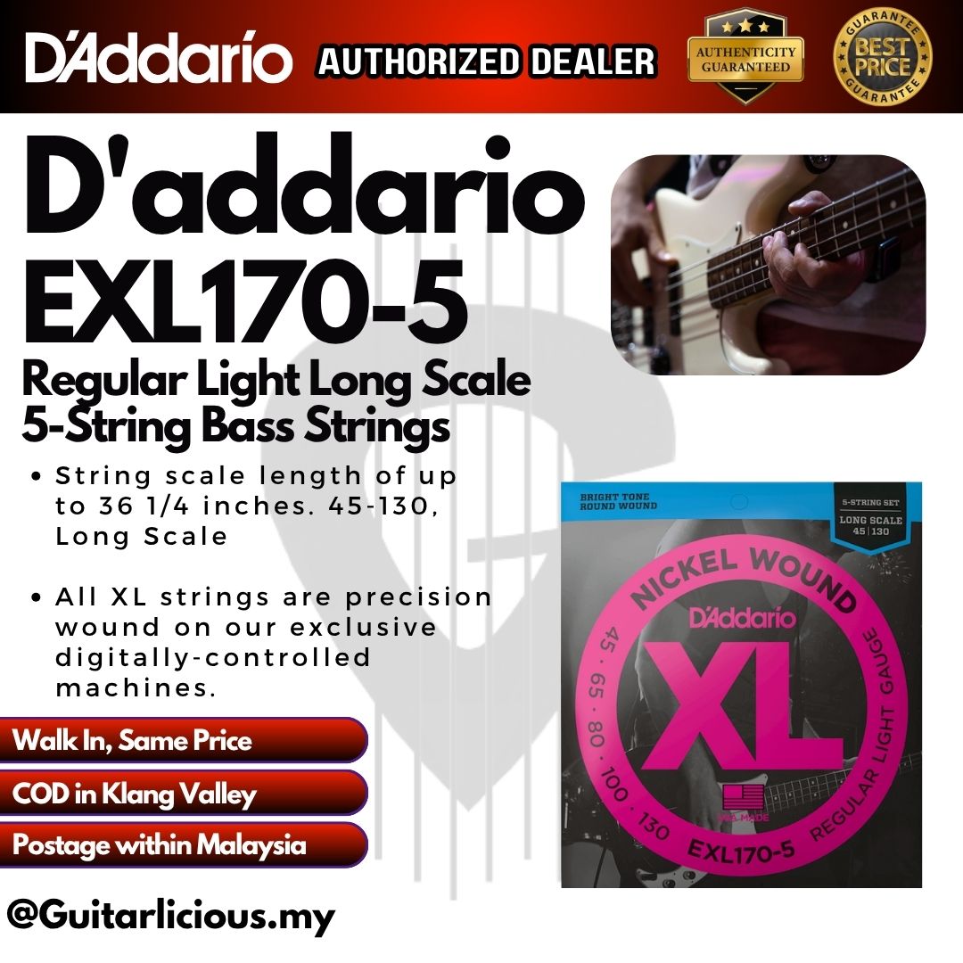 D'Addario XL Nickel Wound Electric Bass strings are world-renowned amongst bass players of all genres and styles. All XL strings are precision wound on digitally-controlled machines, ensuring each string has excellent intonation, clear fundamentals, and unparalleled consistency. EXL170-5 is the 5-string version of the best-selling D'Addario EXL170 bass set. With the addition of the .130 low B string, EXL170-5 offers the ideal combination of distinctive brightness and booming, tight lows. The most versatile and universally appealing set for all playing styles, this set fits long scale basses with a string scale length of up to 36-1/4 inches