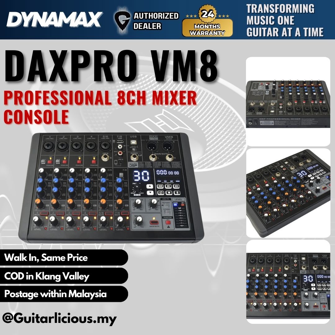 The DYNAMAX DAXPRO VM8 Professional 8CH Mixer Console is an 8-channel, 5-mic/2-stereo channel mixing console designed for live setups, content creation, and studio work. It features integrated USB audio recording, Bluetooth streaming, and built-in digital effects.