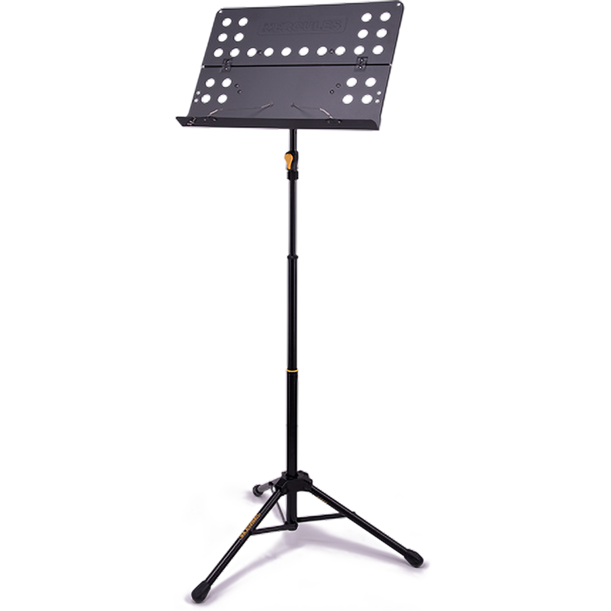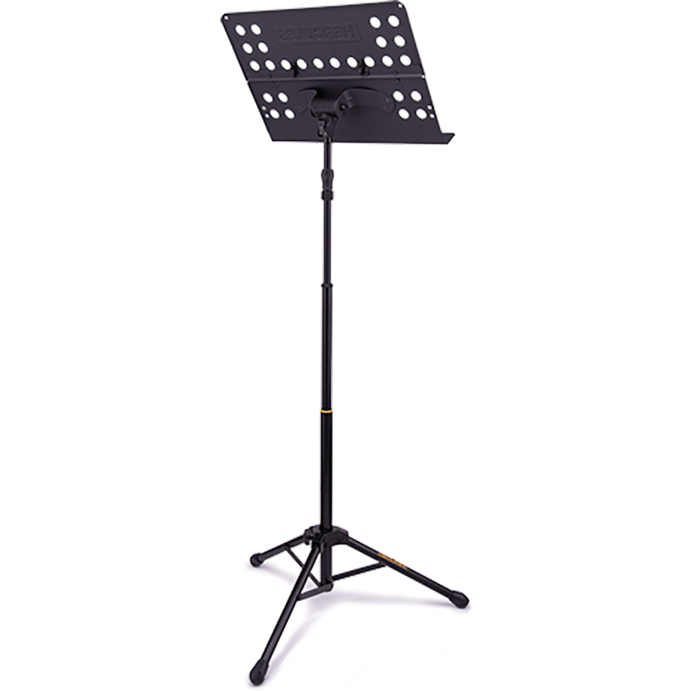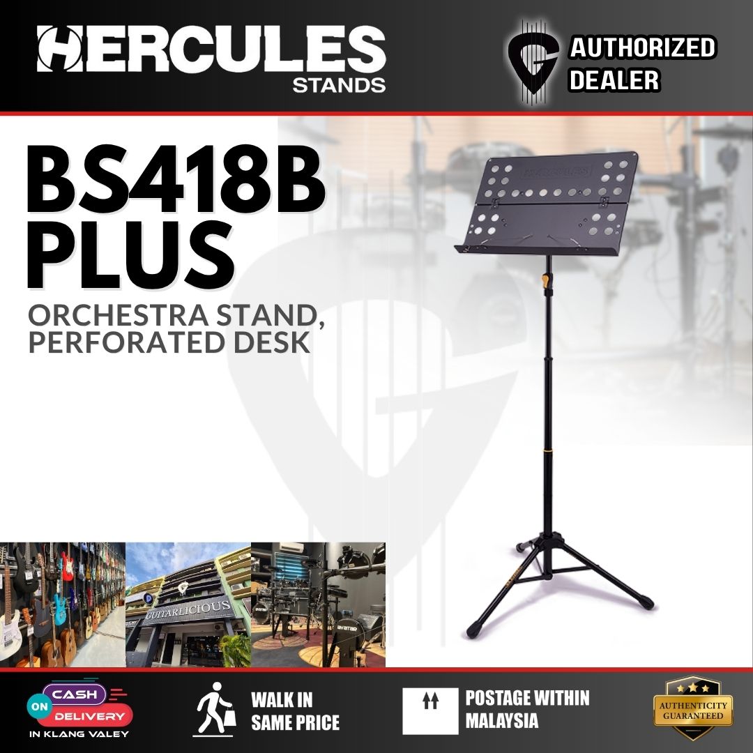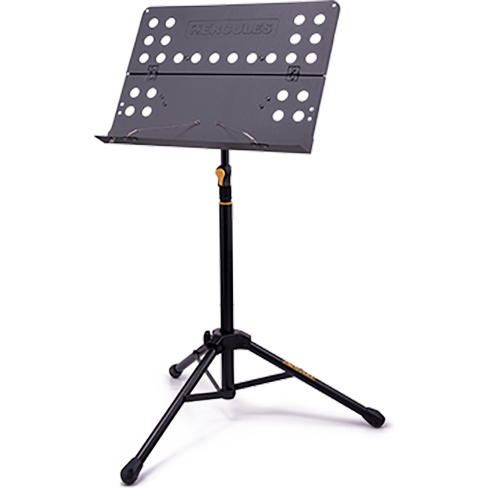 The HERCULES Three-Section Music Stand BS418B PLUS features the EZ Grip Height Adjustment, a perforated folding desk, a foldable tripod base and wire page retainers. H-Clip included.