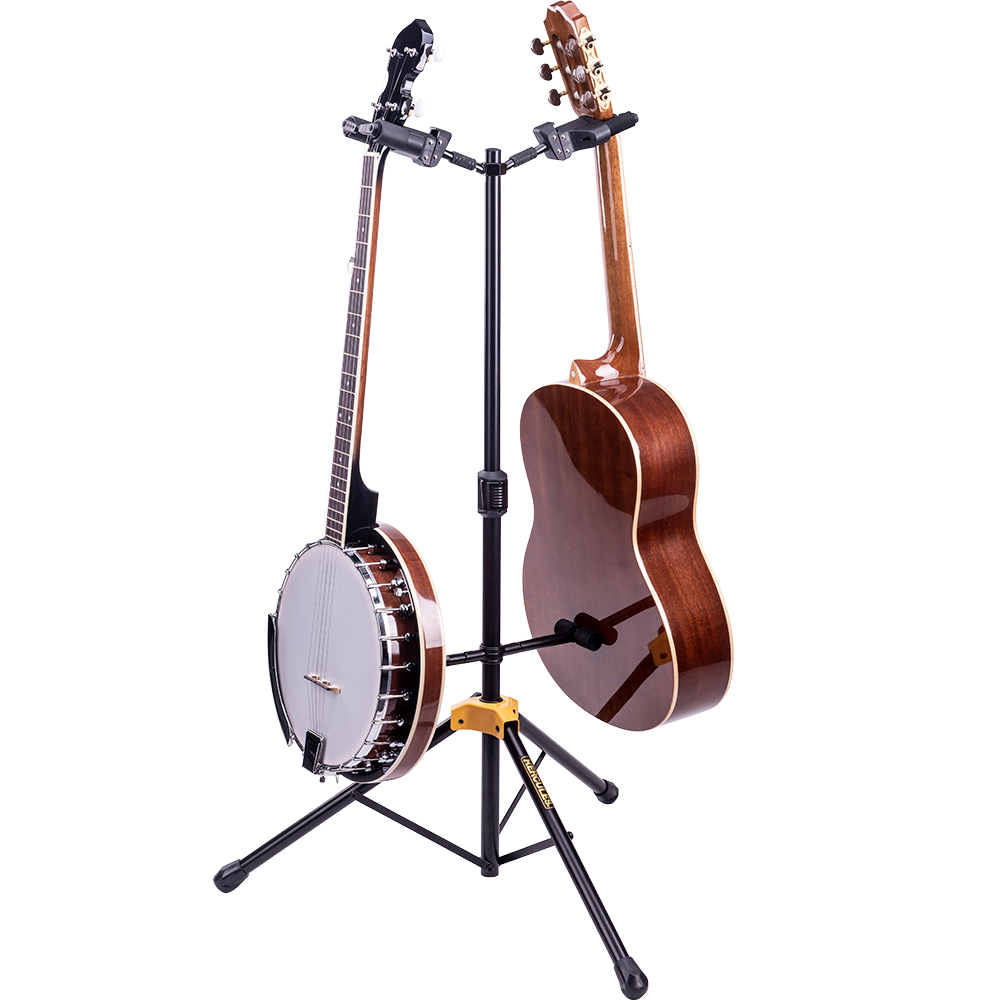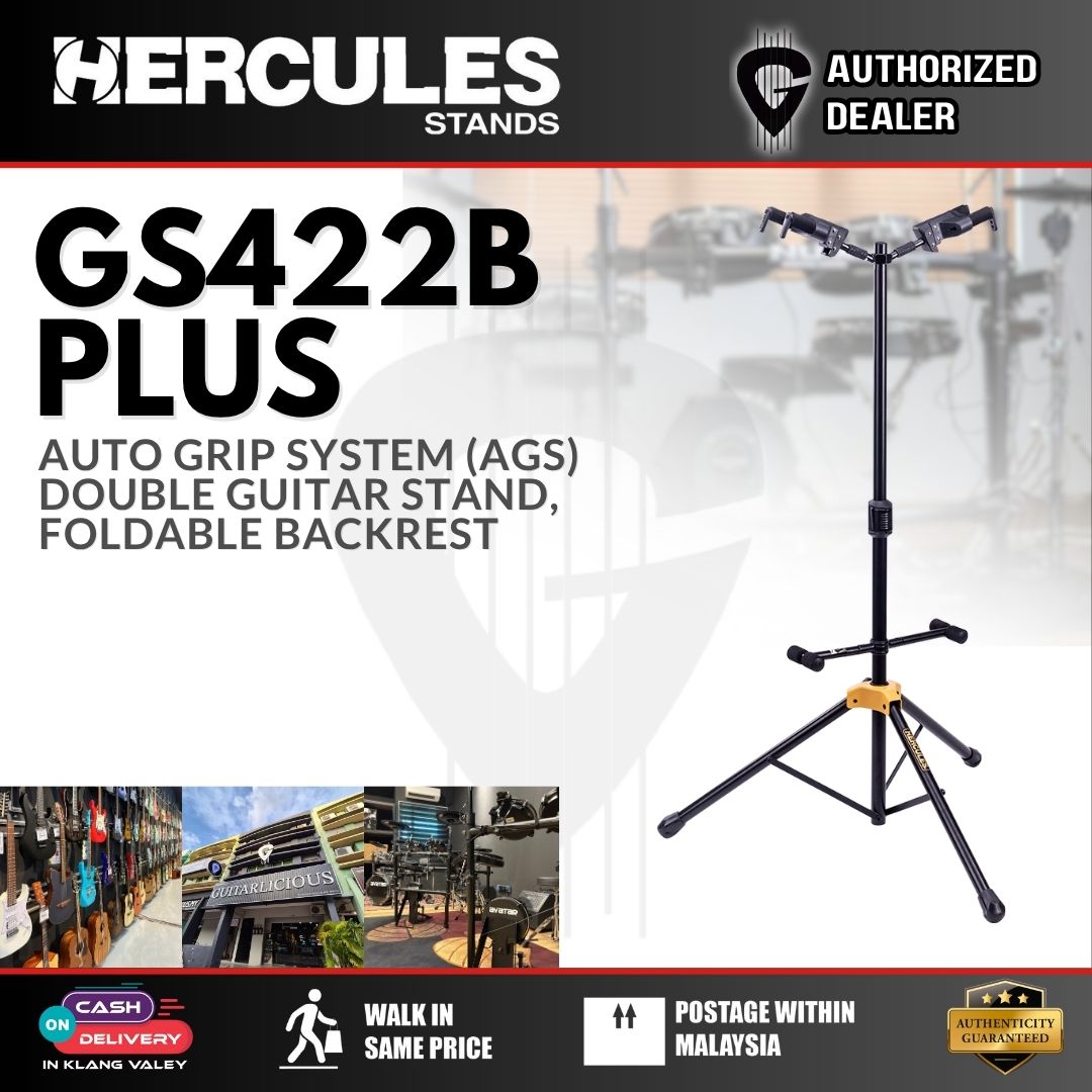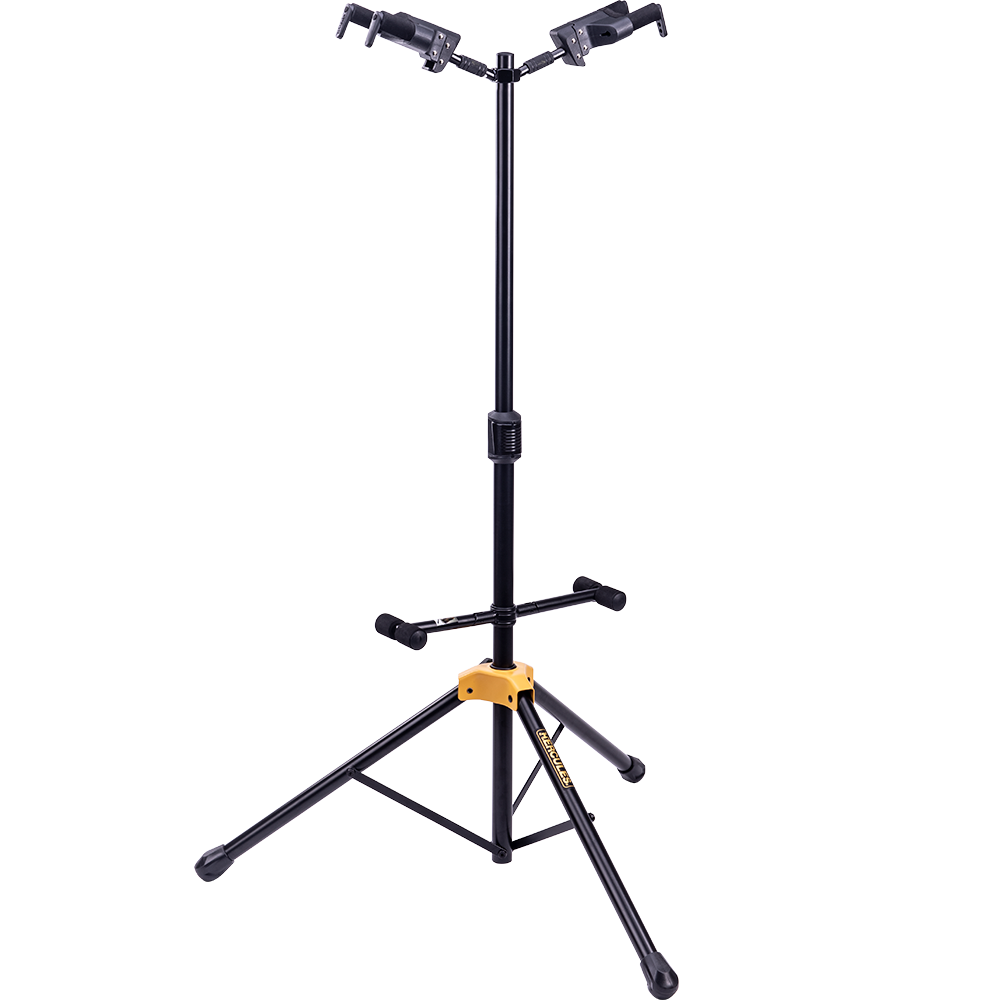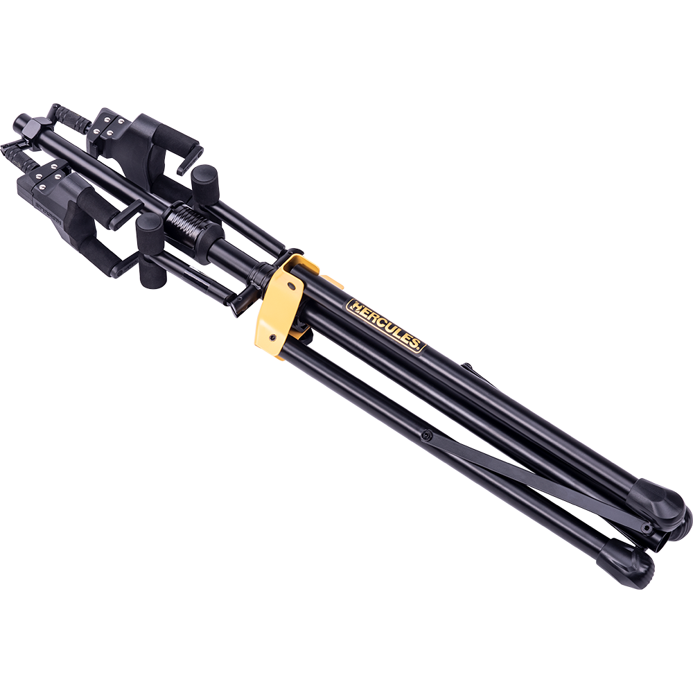 The HERCULES Double Guitar Stand GS422B PLUS accommodates two instruments and features the foldable Auto Grip System (AGS) yokes, Instant Height Adjustment Clutch, Specially Formulated Foam (SFF) padding contacts and the adjustable back rests.