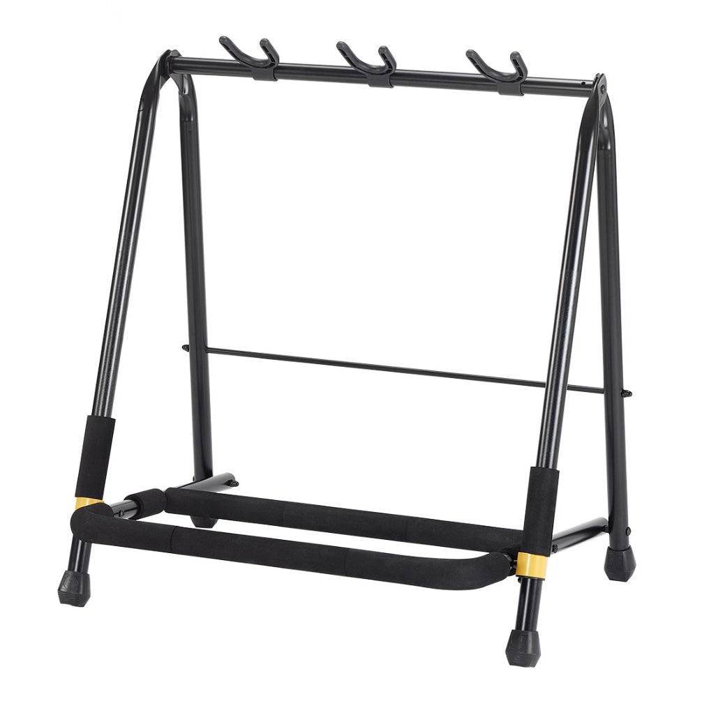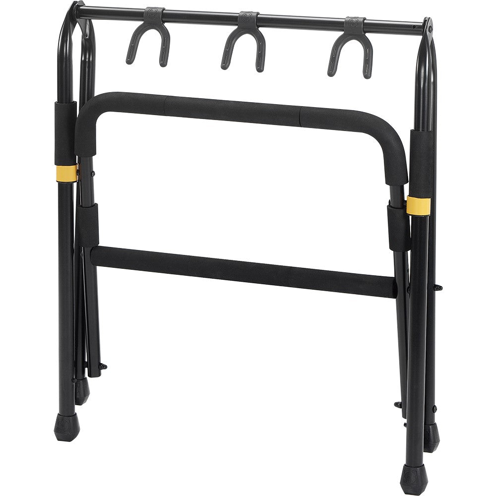 The GS523B PLUS HERCULES Multi-Guitar Rack with add-on casters accommodates three guitars and utilizes Specially Formulated Foam (SFF) padding to cover all contact points. HA205 allows expansion to accommodate up to 6 guitars.