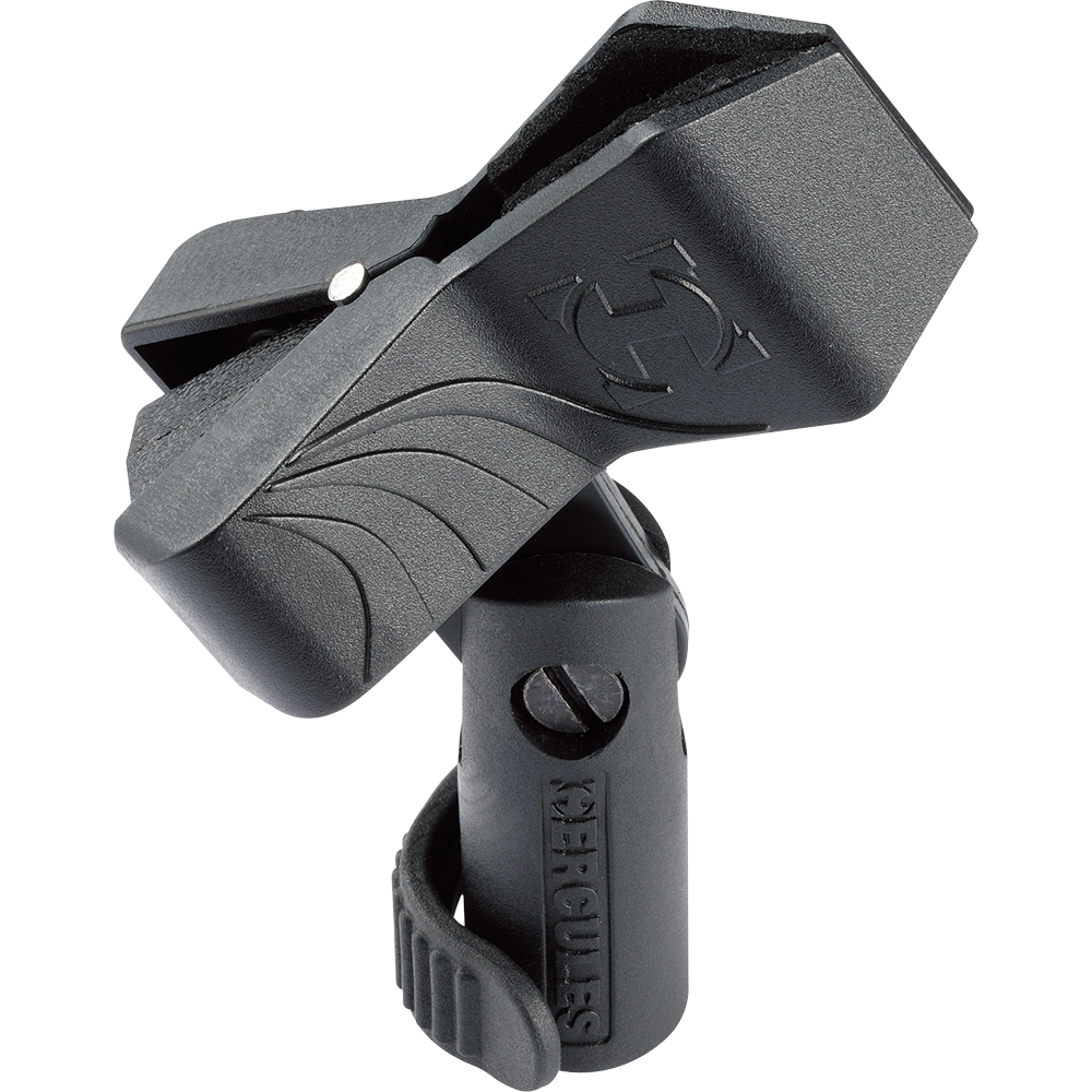 The HERCULES Microphone Holder MH100B connects to a mic stand with the flip lever. Works with both threaded and non-threaded stands. Rubber lined for a secure grip.