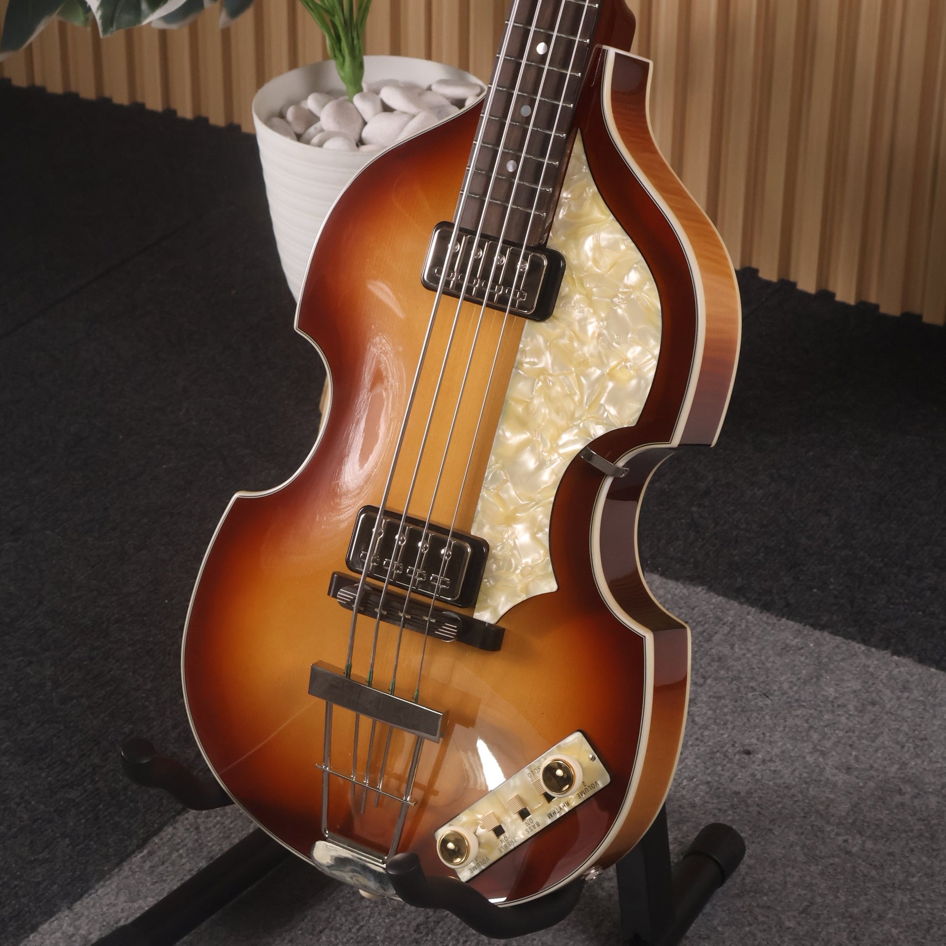 Hollowbody made of flamed maple with spruce top. Two-piece maple neck with rosewood fingerboard. Nut width 42mm, scale length 762mm. Sunburst finish. Including quality Höfner case.