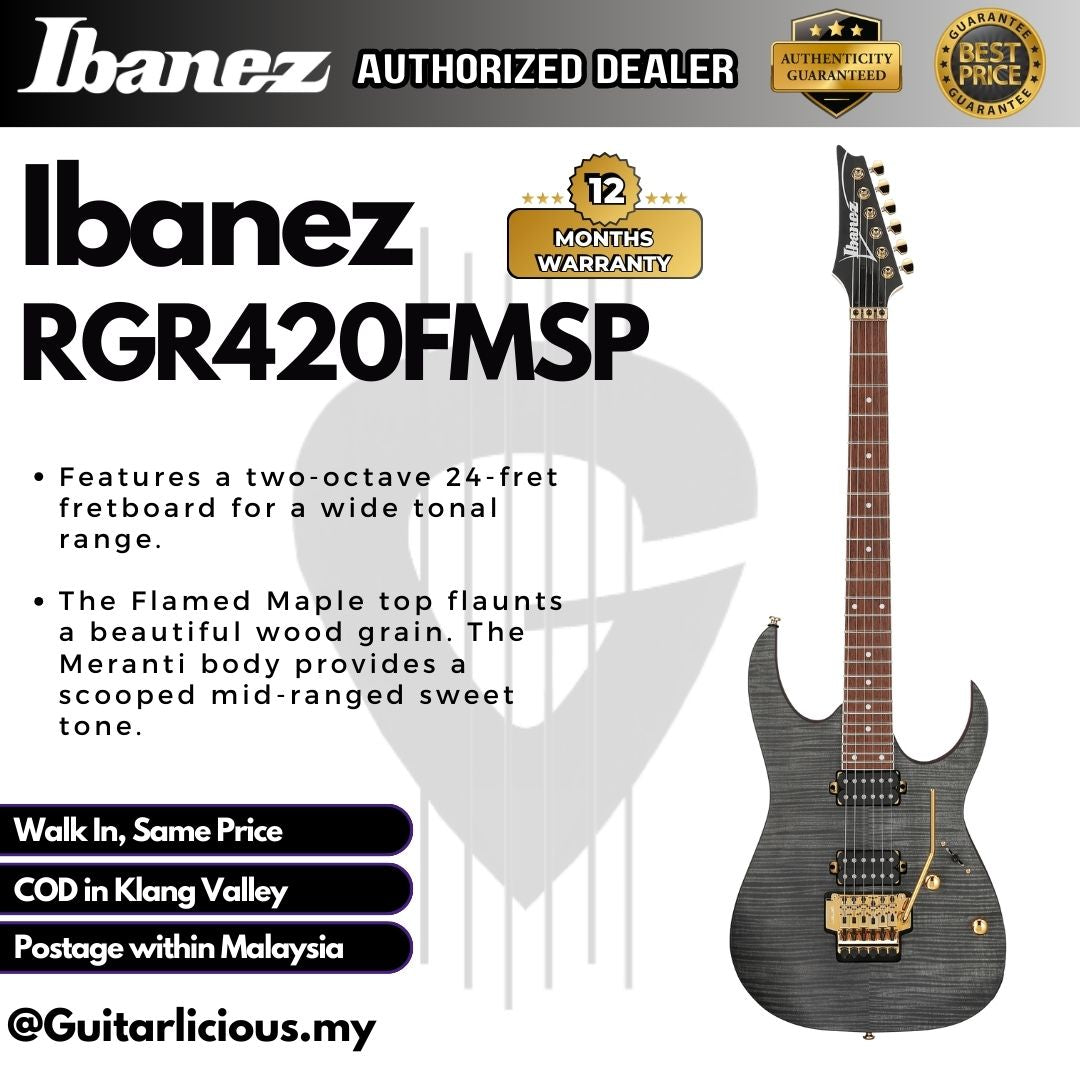 The Ibanez RGR420FMSP-TGF is a high-performance electric guitar from the RG Standard series, designed for speed and metal genres. It features a stunning Flamed Maple top over a Meranti body in a Transparent Gray Flat finish with gold hardware. Key specifications include the thin, fast Wizard III Maple neck and a Jatoba fretboard with 24 jumbo frets.It’s equipped with Quantum humbucking pickups (H-H configuration) that deliver a tight low-end and articulate note definition. The double-locking tremolo bridge ensures rock-solid tuning stability, even during aggressive use like dive-bombs, making it a reliable and visually striking machine for demanding players.