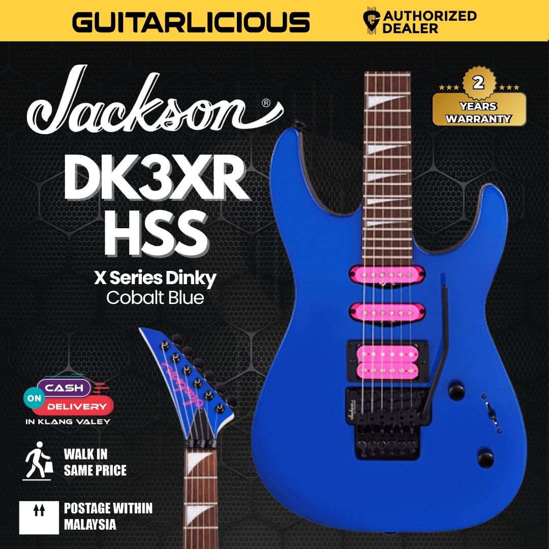 Captivating in both sound and style, the X Series Dinky DK3XR HSS is dressed in Cobalt Blue with a color matched reverse Jackson pointed 6-in-line headstock and black hardware. The Cobalt Blue features pink pickup bobbins and pink Jackson headstock logo.