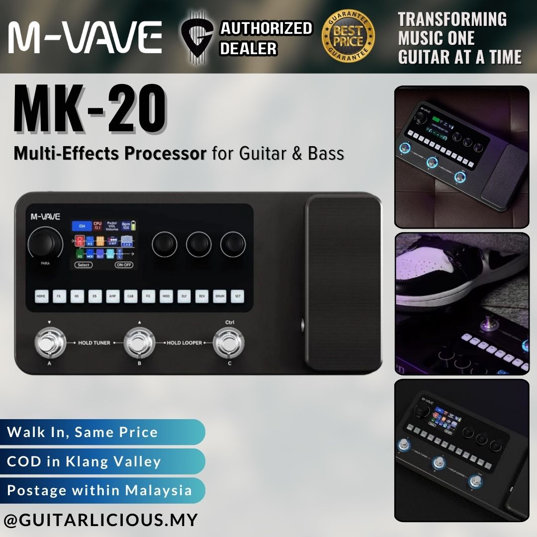 The M-VAVE MK-20 is a versatile multi-effects processor pedal designed for both guitar and bass players. It integrates advanced Audio Neural Network (ANN) Modeling Technology to deliver a wide range of authentic tones. With its compact design, extensive effects, amp models, and built-in tools such as a drum machine and looper, the MK-20 serves as an ideal solution for practice, recording, and live performance. Its 2.4" LCD screen, editable tone library, and global EQ make it user-friendly, while the flexible effect chain and large variety of amp and effect modules provide great sound-shaping flexibility. The unit also supports third-party impulse responses and offers long battery life for portable use.