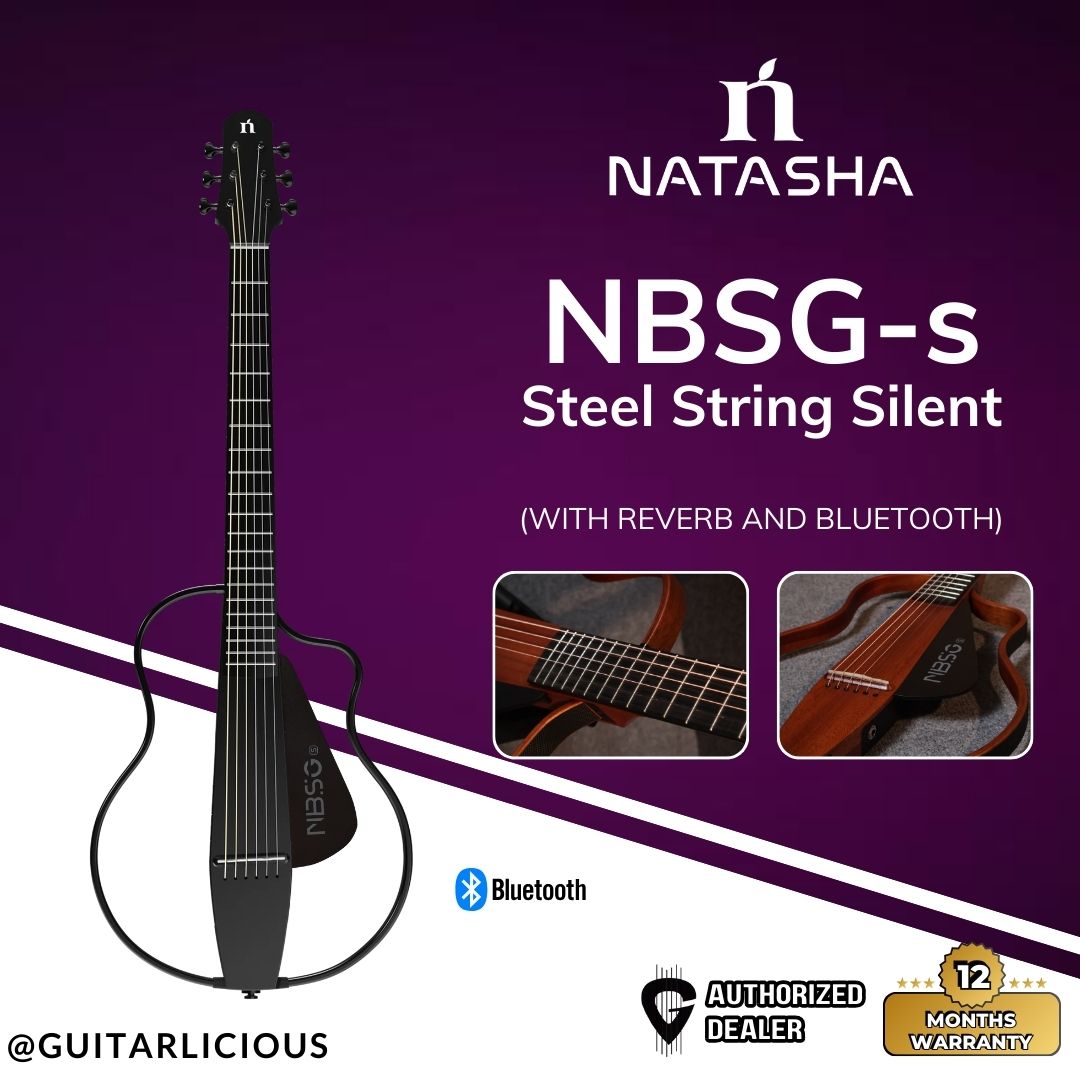Natasha NBSG-s Steel String Silent Smart Guitar (with Reverb and Bluetooth) - Non Rechargable - Black. The Natasha NBSG Steel String Silent Smart Guitar includes features like reverb, Bluetooth connectivity for app control, and a built-in rechargeable 2000mAh battery that lasts up to 20 hours, rather than being non-rechargeable.