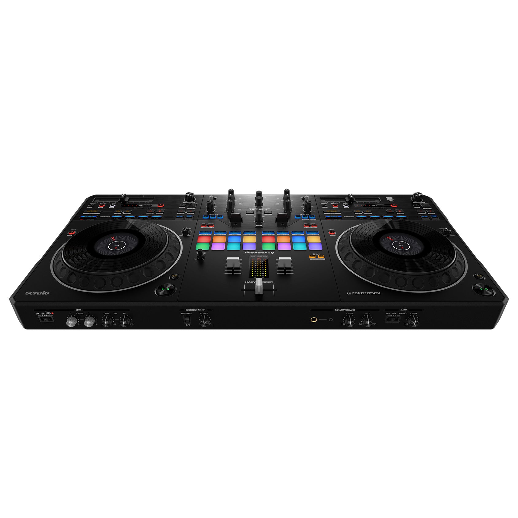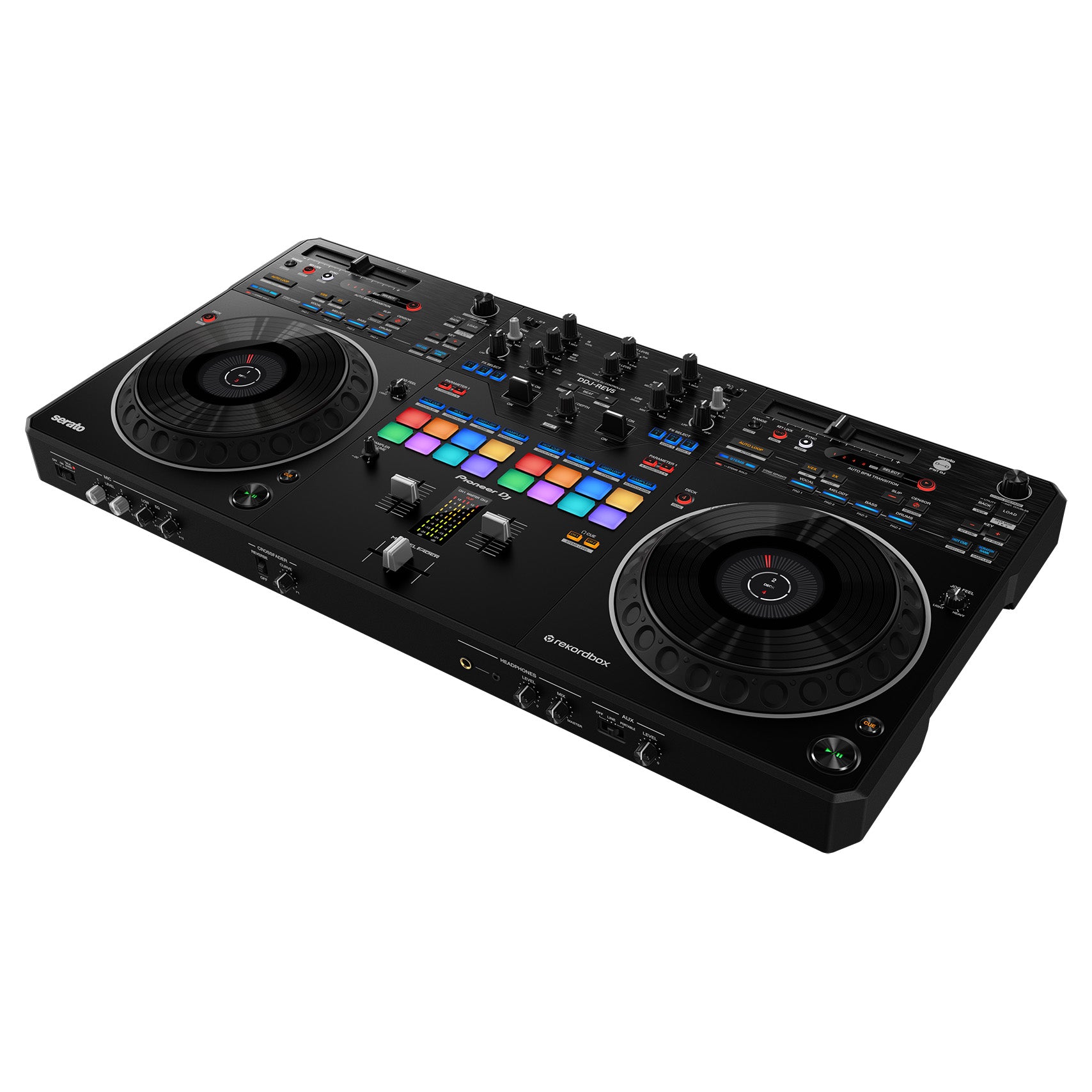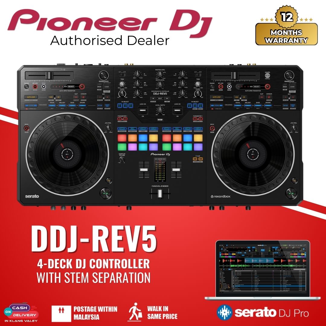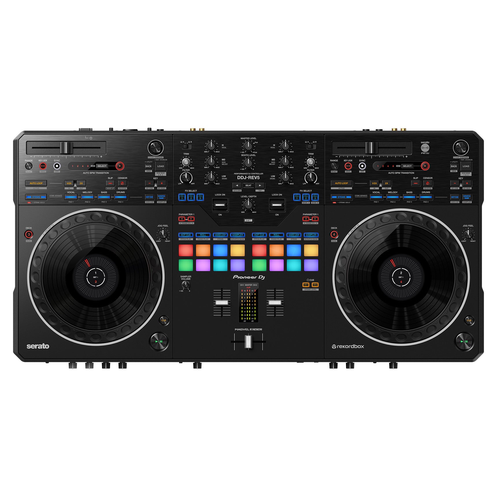 The DDJ-REV5 is a new-generation controller with Serato DJ Pro and rekordbox compatibility. This 2-channel unit offers an authentic scratch experience and innovative features including its large jogs, MAGVEL FADER, dedicated buttons for Stems control, the first-ever Auto BPM Transition, and Piano Play mode.