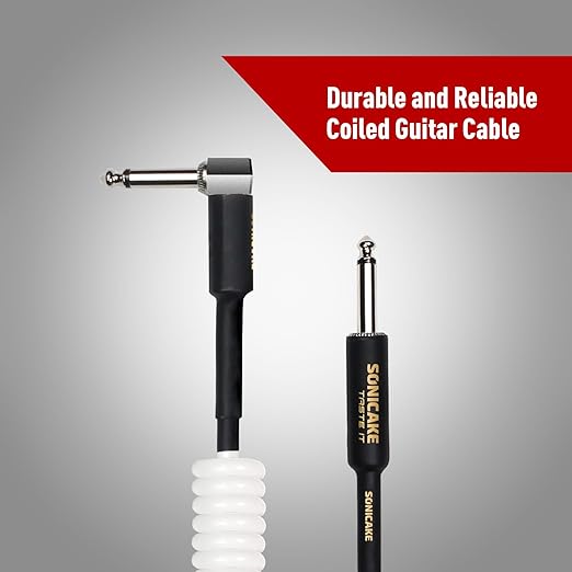SONICAKE coiled guitar cable allows for easy and free movement while playing, no tangles or tripping over it.Equipped with OFC 24AWG conductor and layers of shielding materials, it gives you a clear sound with no unwanted noise.Right angle to straight jacks can be unscrewed and their inner joint points are sealed with heat shrink to withstand constant use.