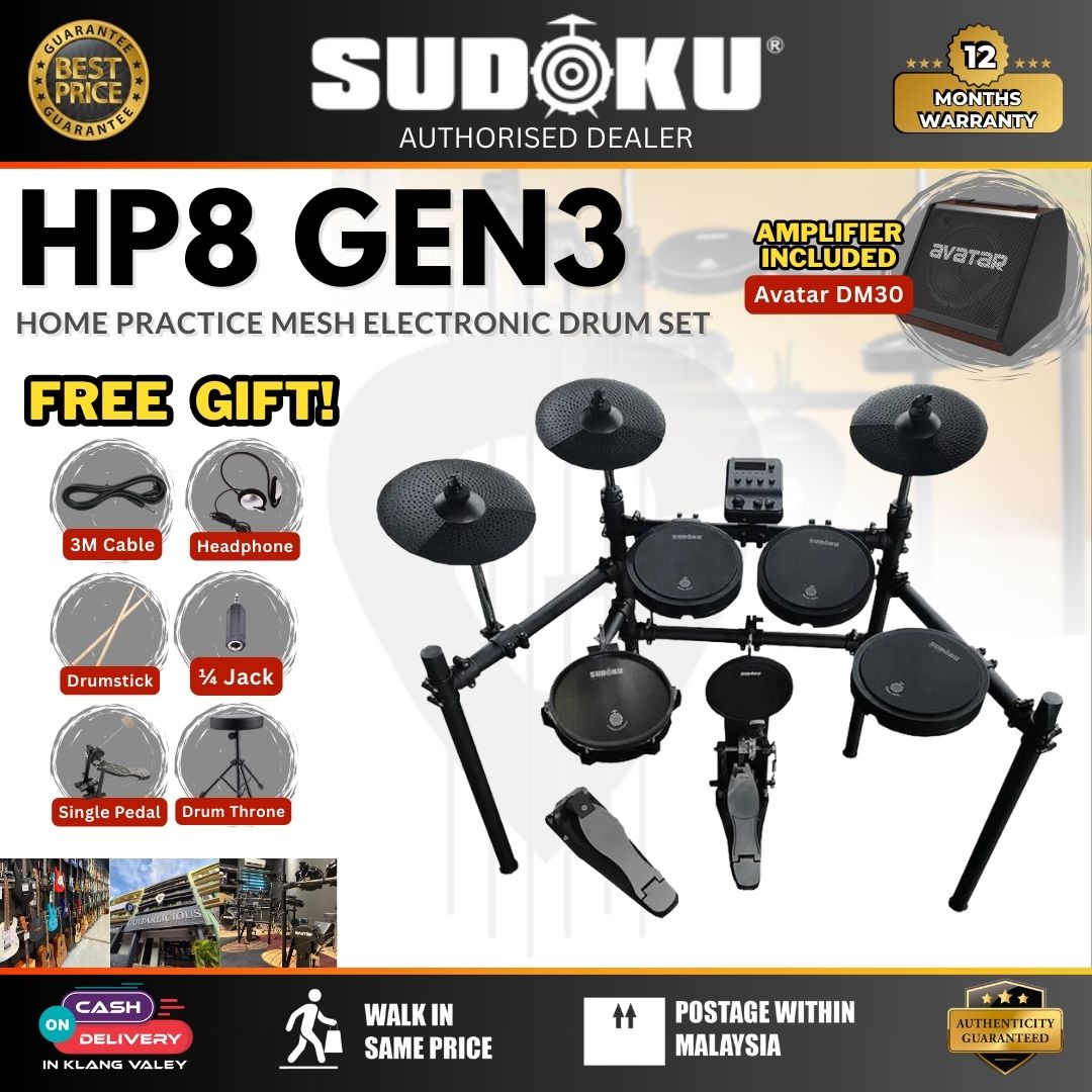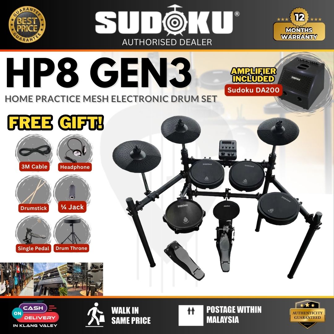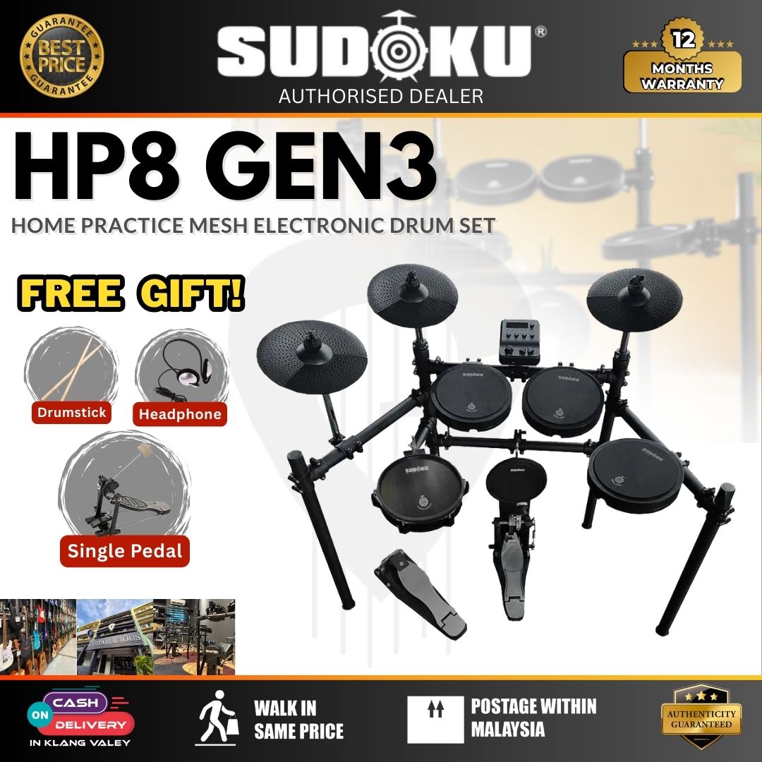 Master your drumming skills with the Sudoku Home Practice HP8 Gen 3 Mesh Black Electronic Drum Set, the perfect kit for beginners and seasoned players alike. Compact, reliable, and feature-rich, this set is ideal for quiet home practice or small studio setups.