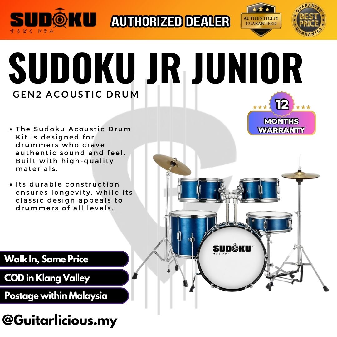 Sudoku JR Junior Gen2 Acoustic Drum Set with Cymbals - Hairline Blue.Sudoku JR design for beginner drummers to start a lifetime of music making.we also have JR Adult for those drummer who looking for portable size play onstage/busking/onstreet.This drum kit comes with everything you need to get started