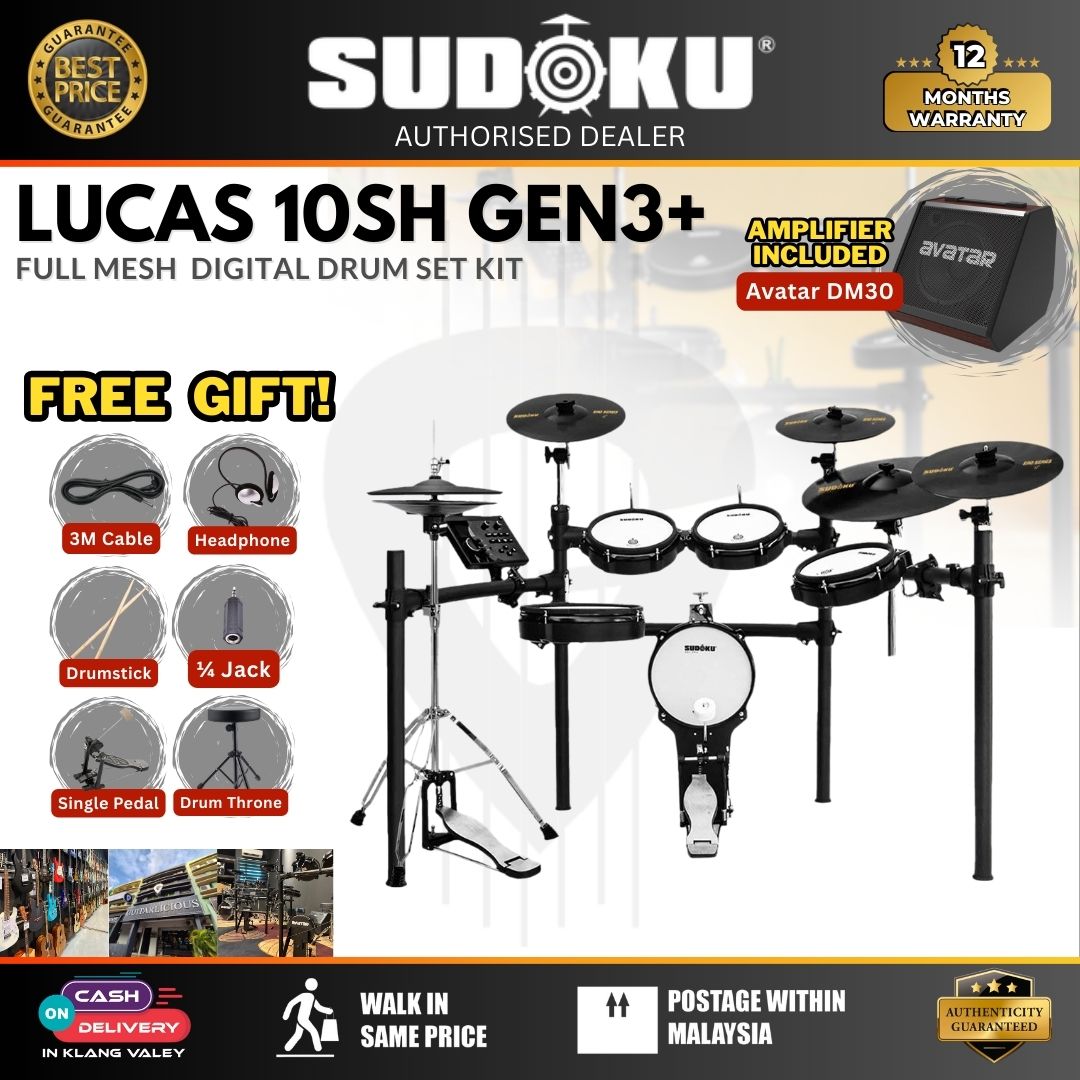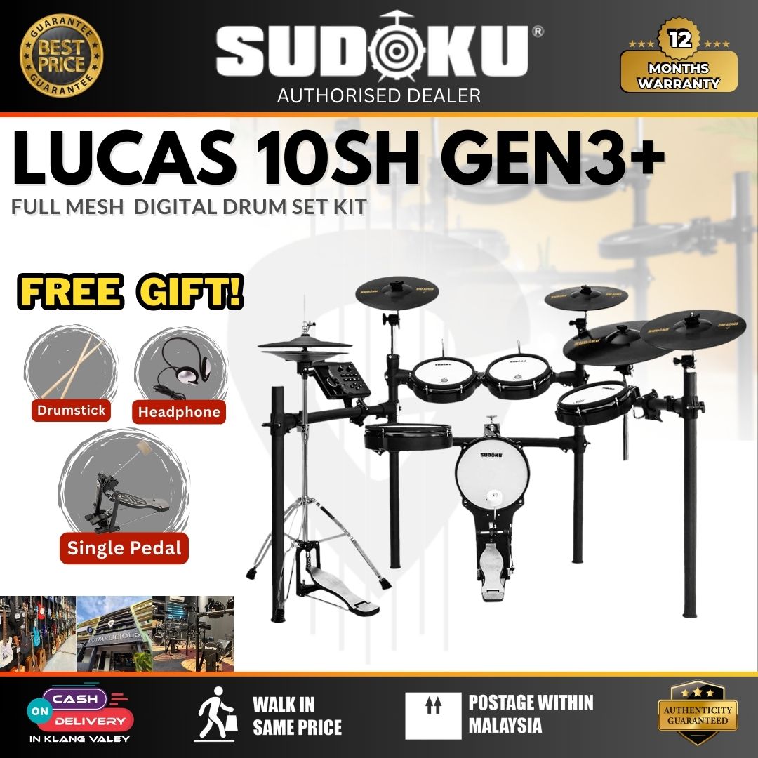 The Sudoku Lucas 10SH with Gen3+ Module Series is a 10-piece electronic drum set designed for drummers of all levels. It features full mesh heads for a realistic feel and includes various accessories depending on the package. The "Gen3+" module indicates an advanced sound engine and improved features over previous generations
